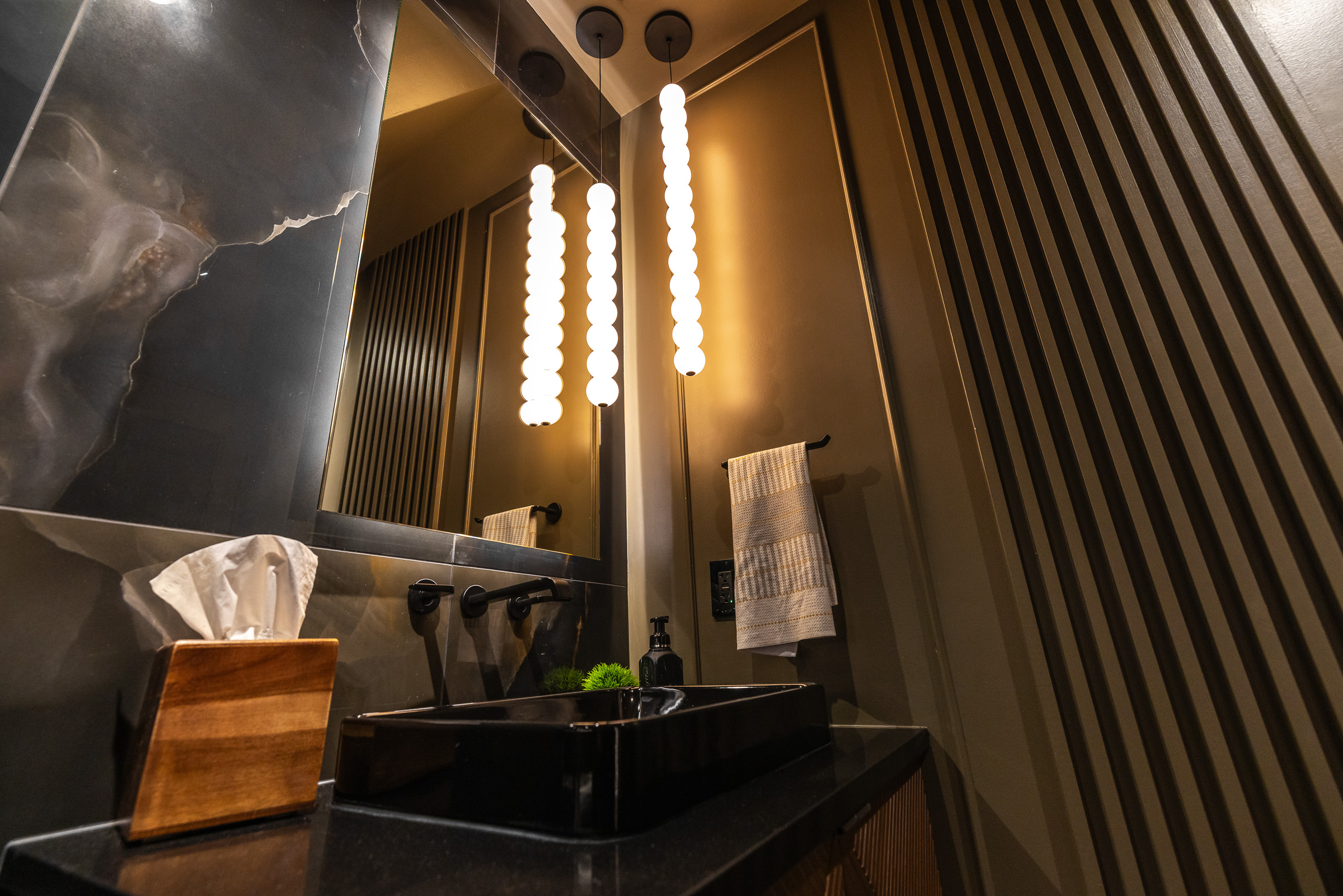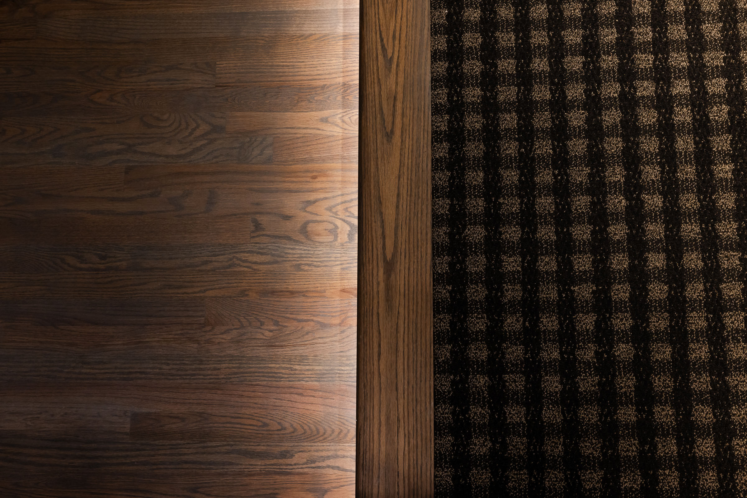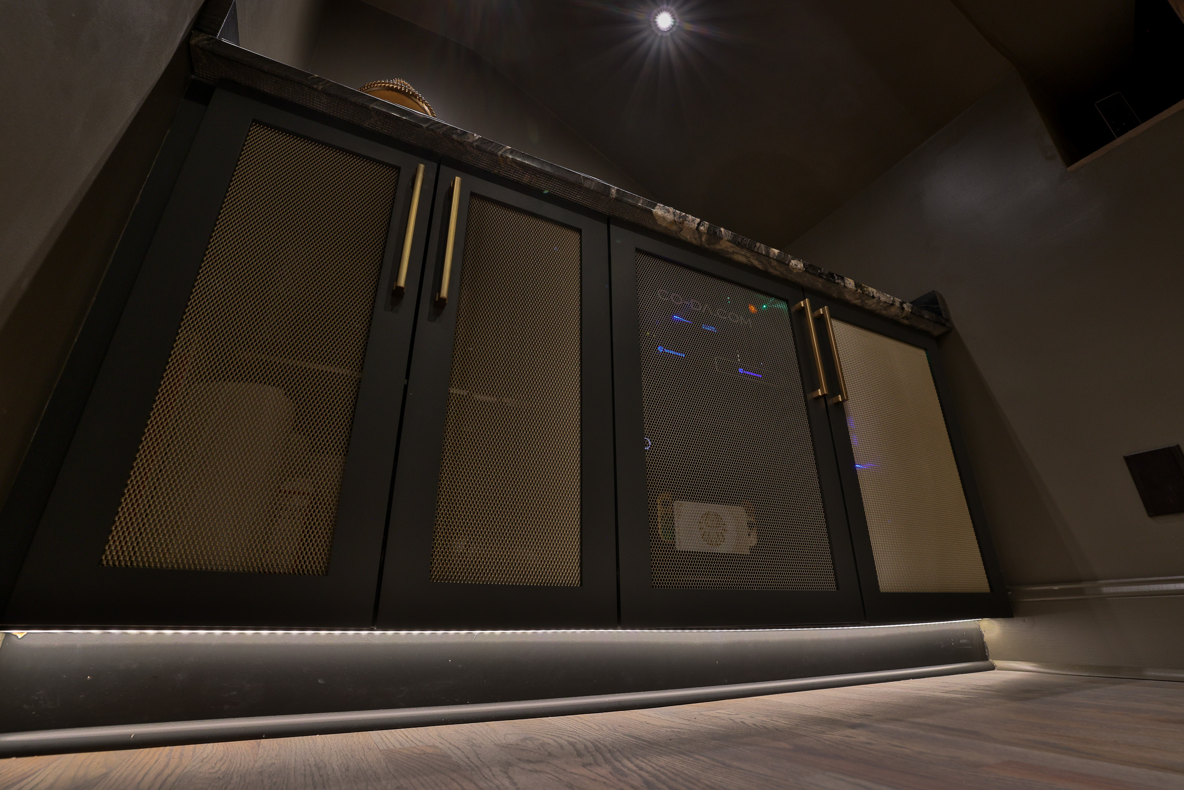 This project pulled out all the stops. From the ground up, we transformed the space with custom carpentry: striking architectural beams, bespoke cabinetry, upgraded flooring, and detailed trim work that gives the room a bold, theater-worthy presence.