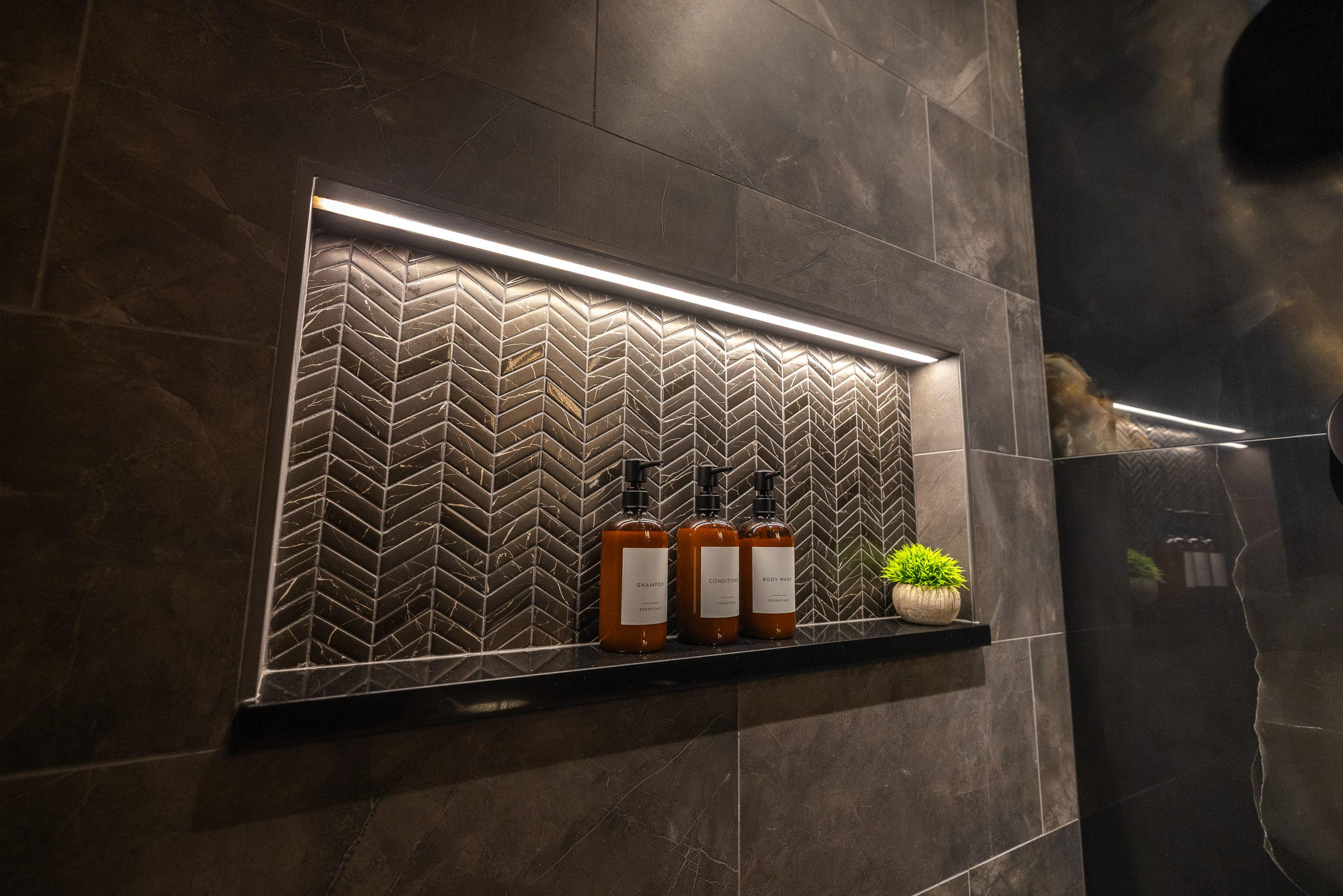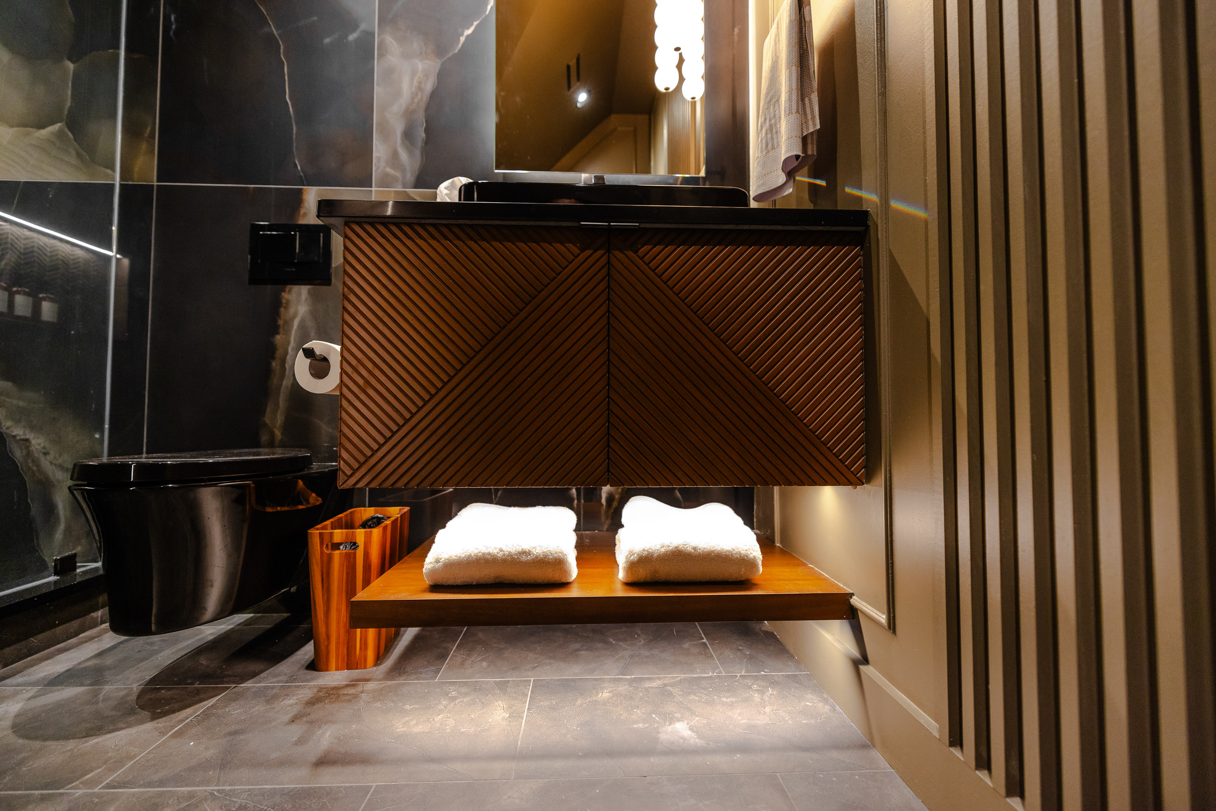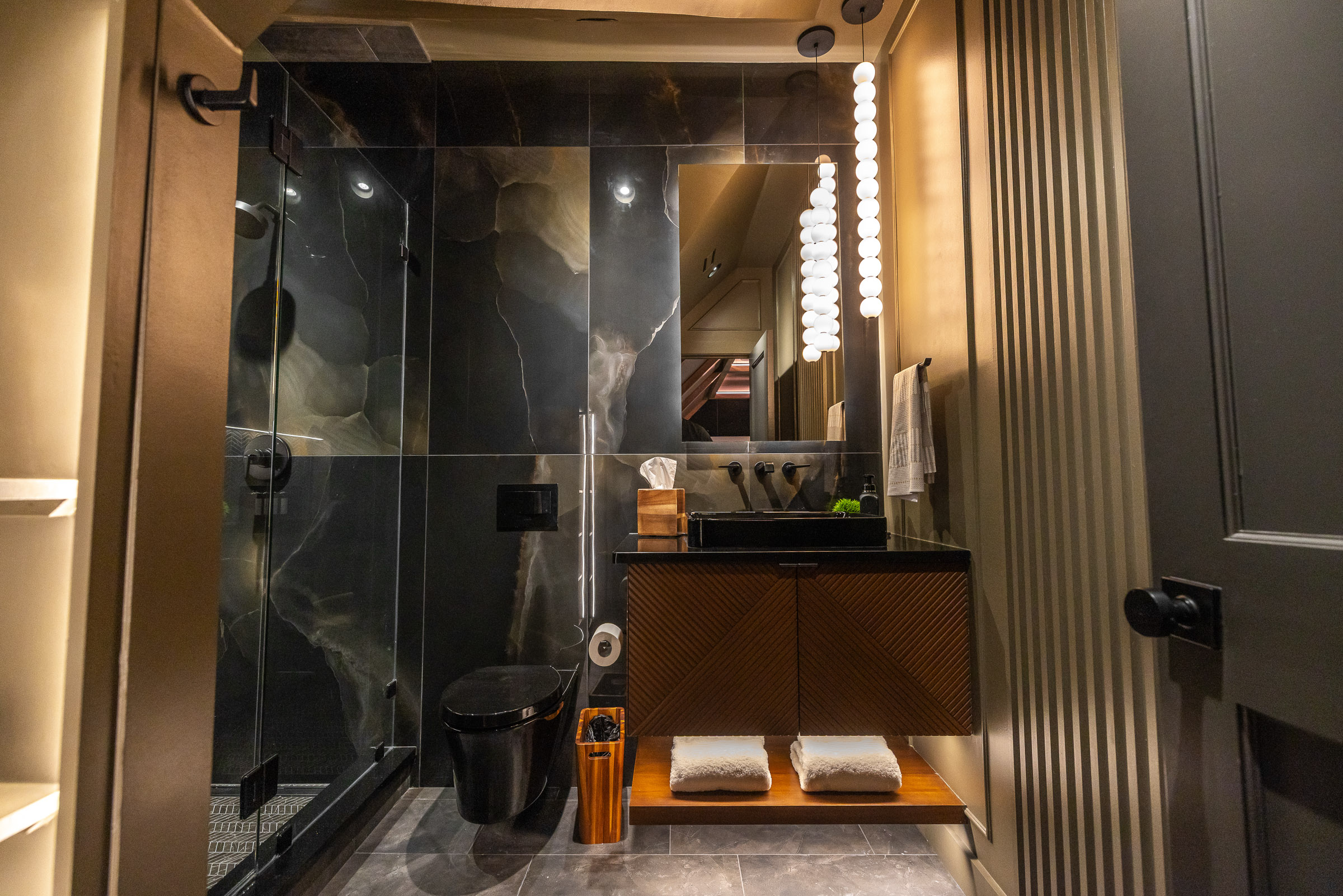 This project pulled out all the stops. From the ground up, we transformed the space with custom carpentry: striking architectural beams, bespoke cabinetry, upgraded flooring, and detailed trim work that gives the room a bold, theater-worthy presence.