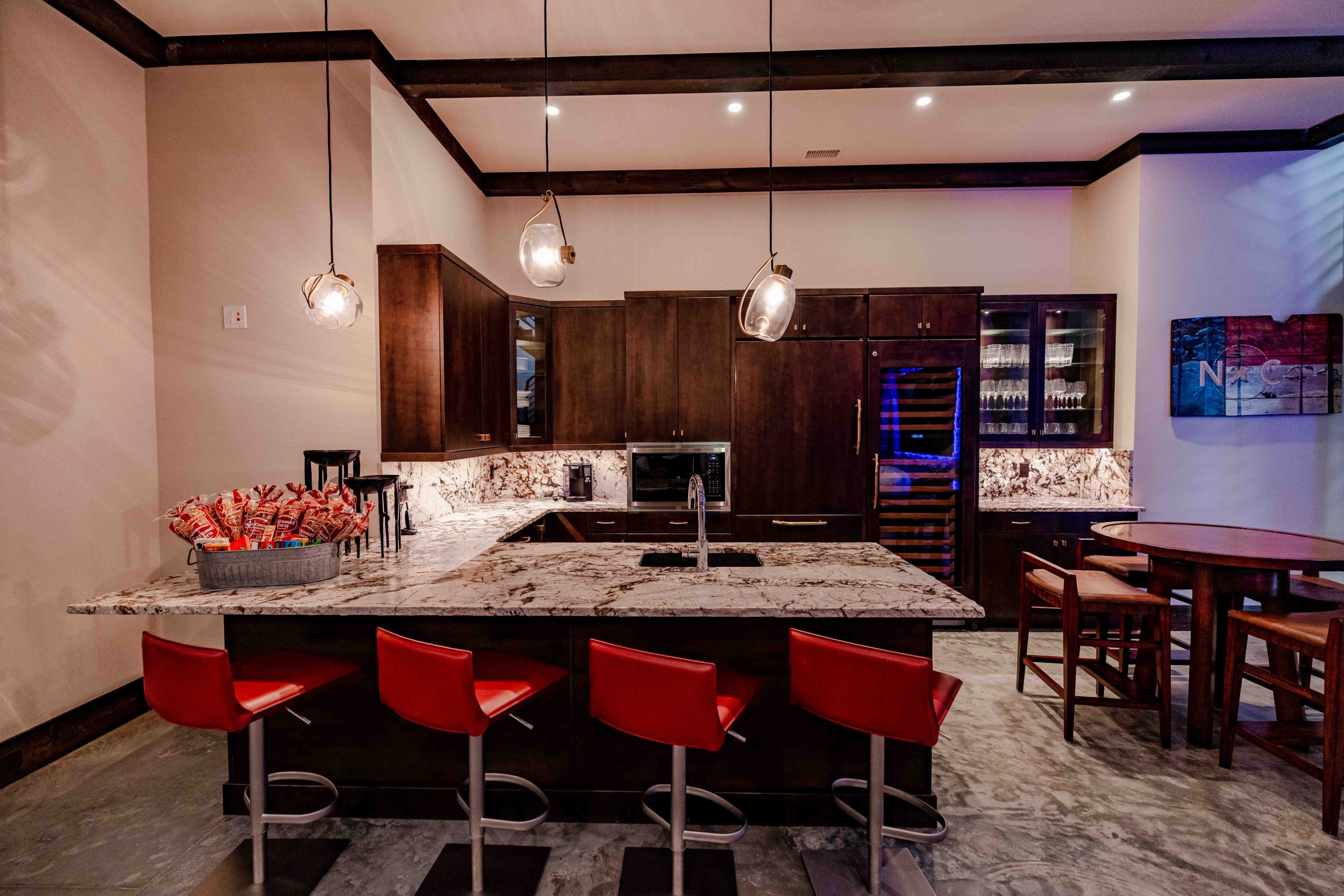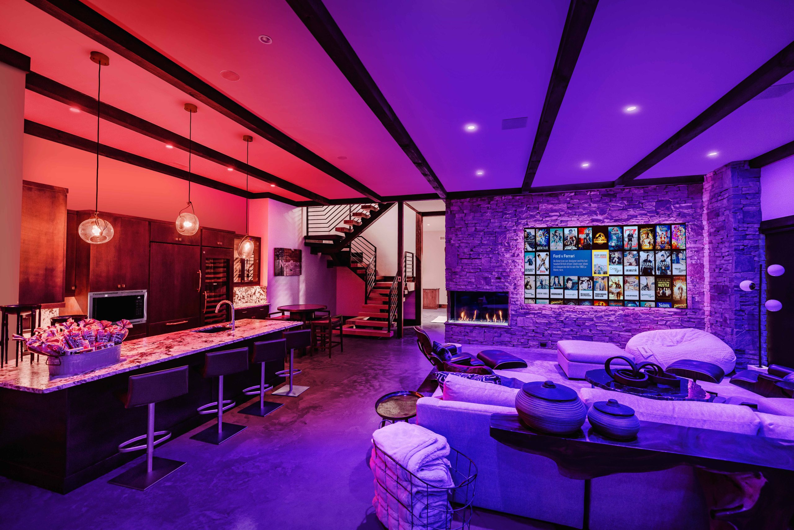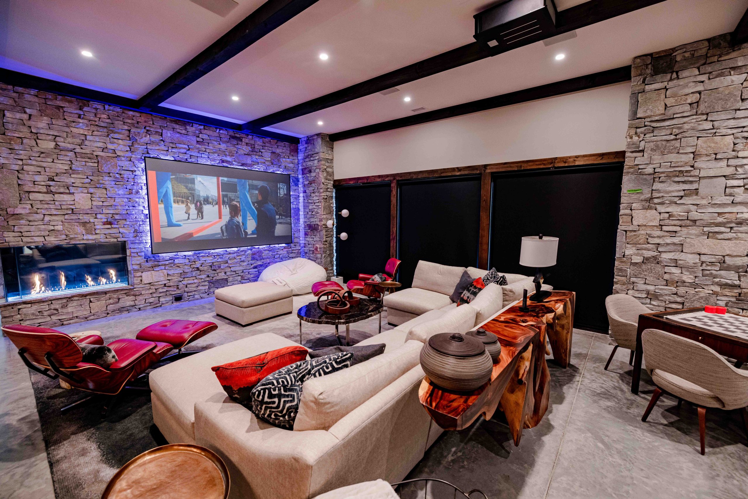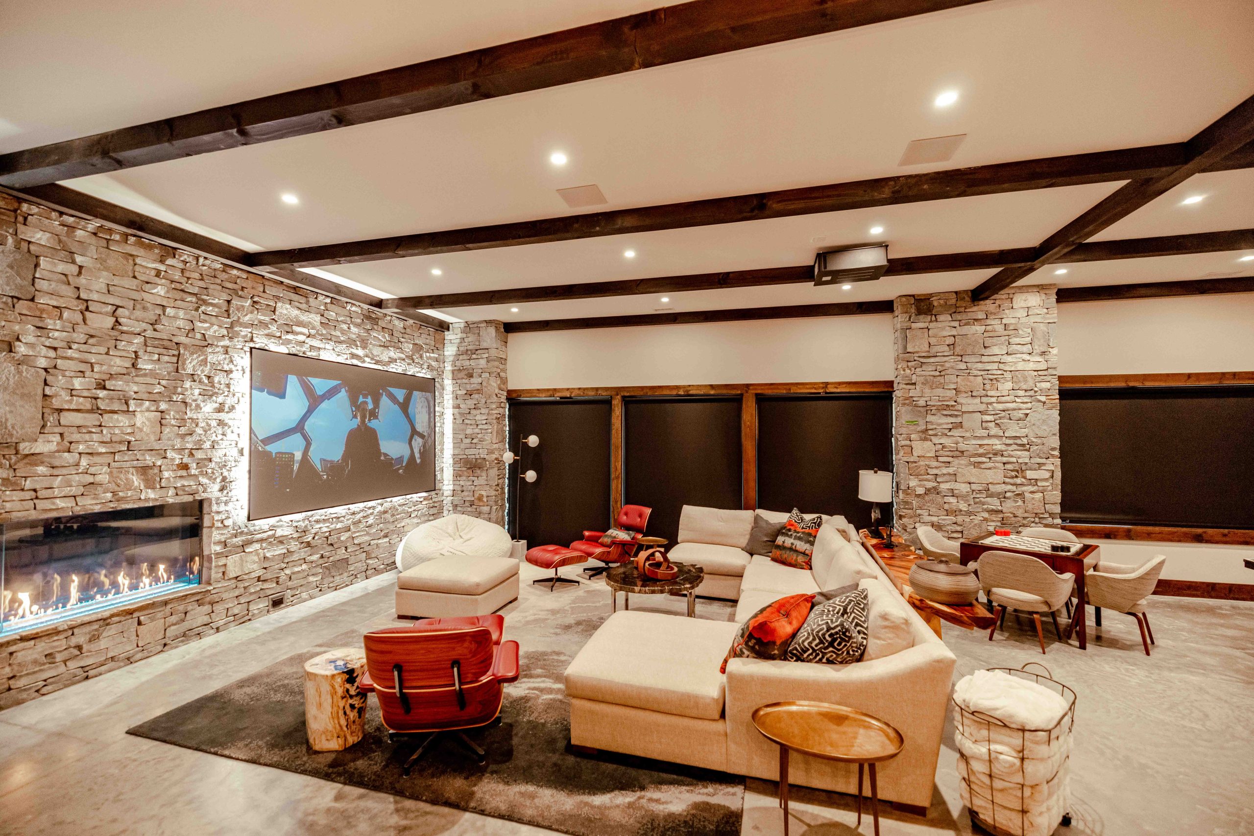 Tucked beneath the mountain retreat lies a theater that could rival any Hollywood screening room. This space combines sight, sound, and comfort in perfect harmony—thanks to a 4K Wolf Cinema laser projector, a 130-inch Screen Innovations Black Diamond display, and a Dolby Atmos surround system by Pro Audio Technology. Acoustic treatments and automated lighting set the mood for any movie night, all controlled at the touch of a button.