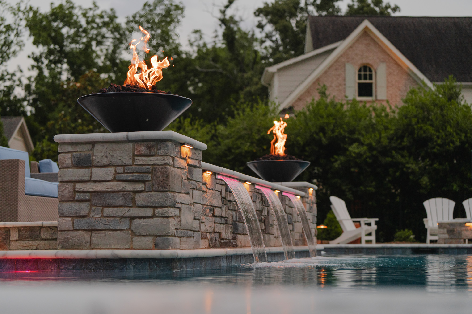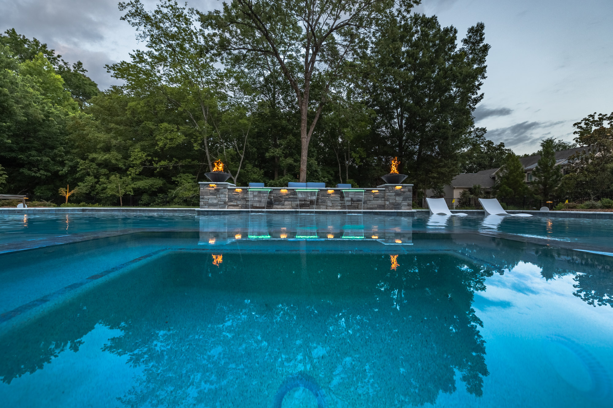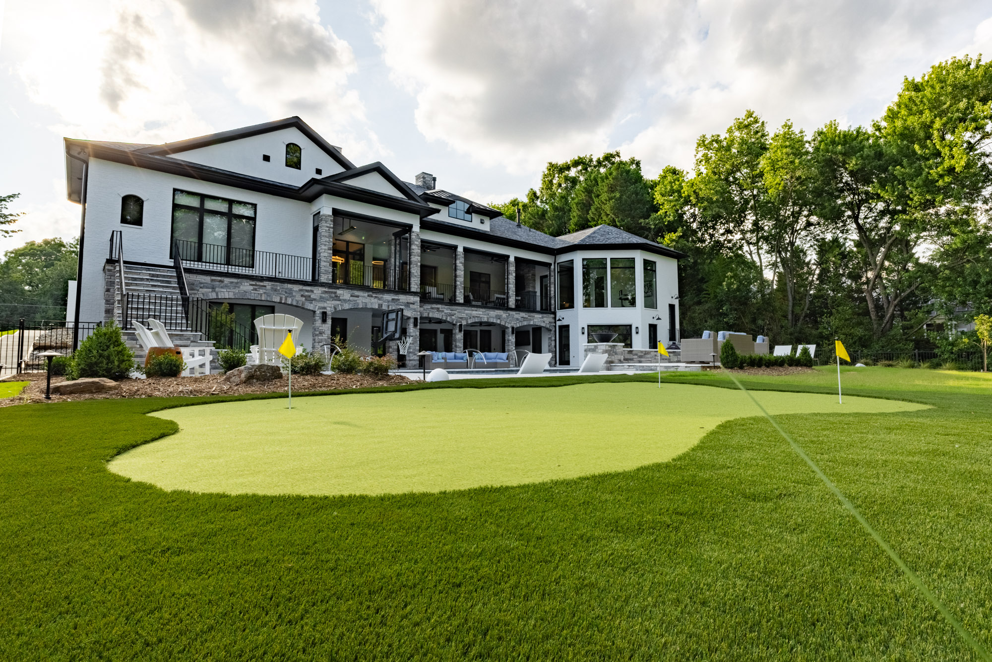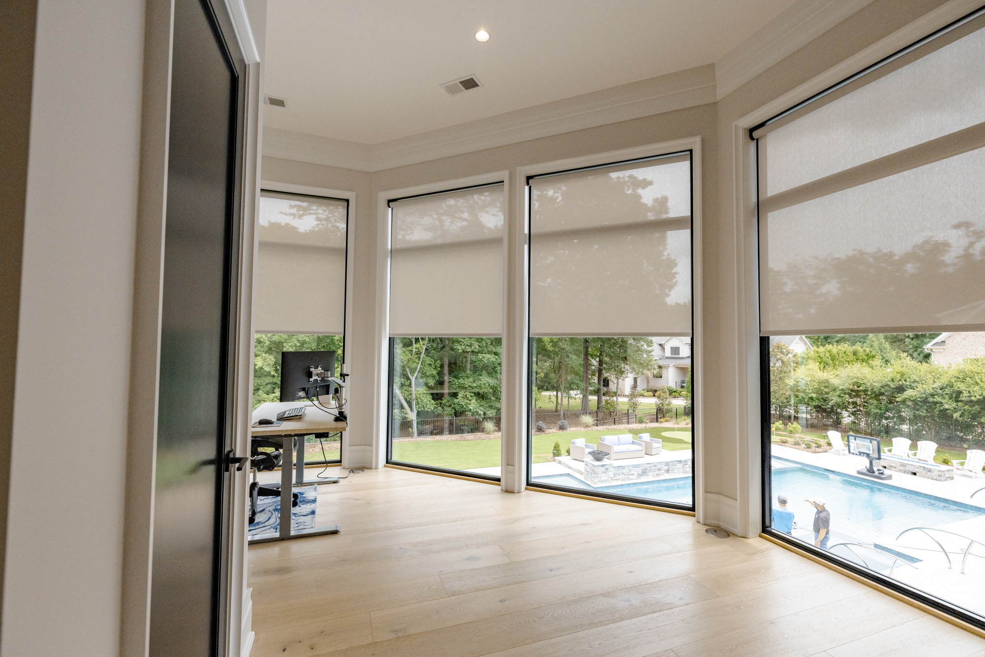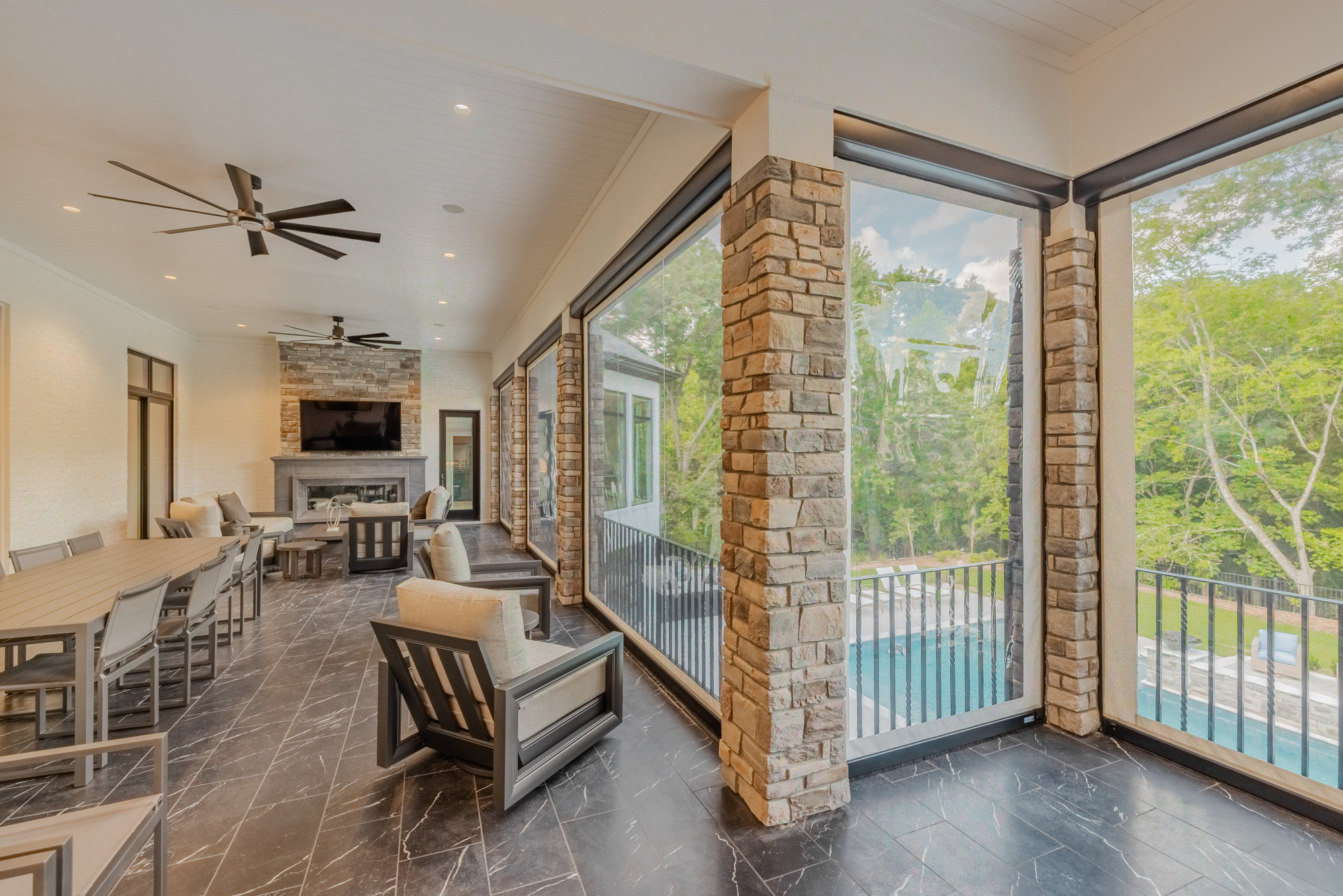 On the upper terrace, form meets function with motorized insect screens and vinyl enclosures that transform the space at the touch of a button. Whether it’s keeping the summer breeze bug-free, blocking a sudden chill, or creating year-round comfort for gatherings, these systems extend the living space without compromising style. Fully integrated with the Savant control system, the terrace adapts instantly to the season, the moment, and the mood.